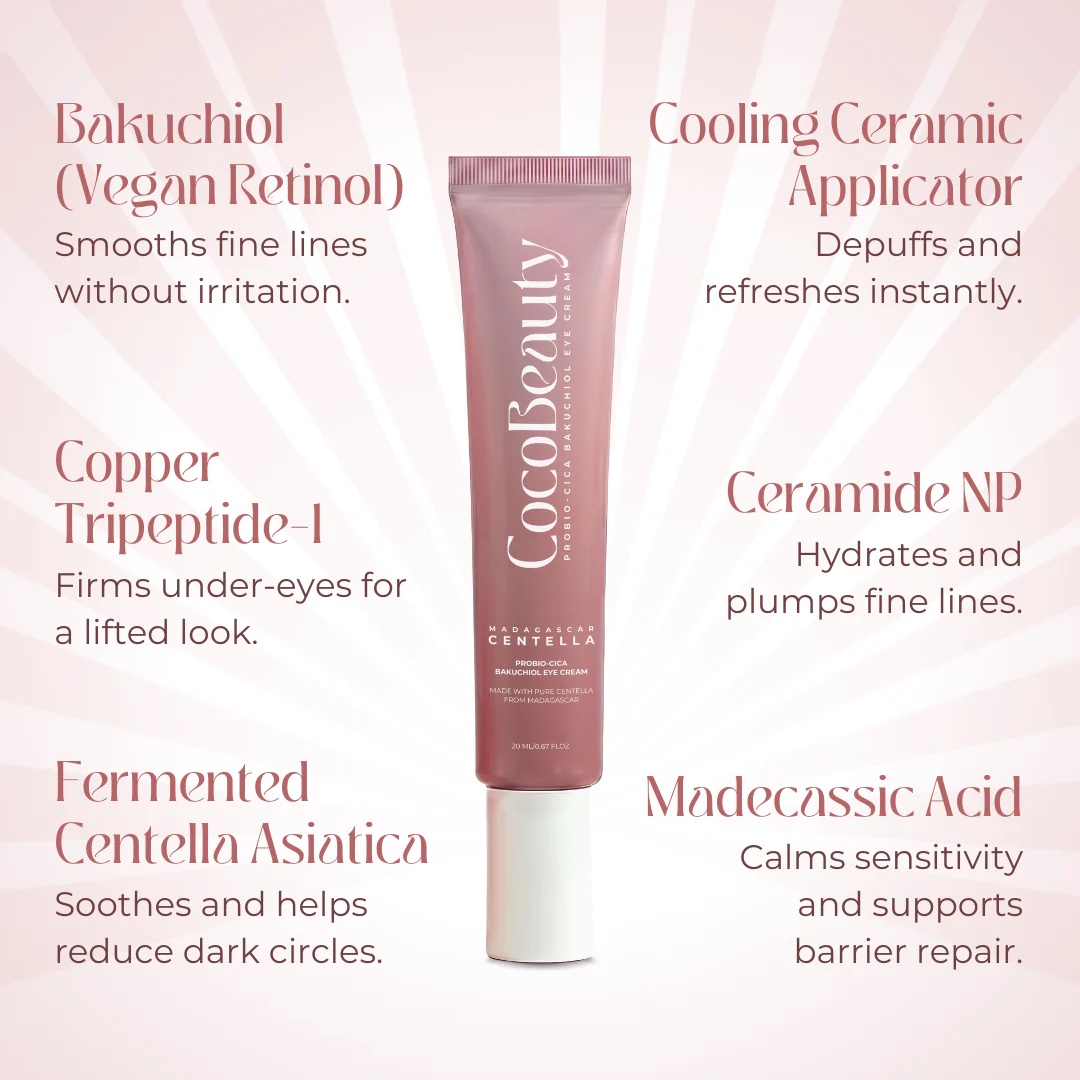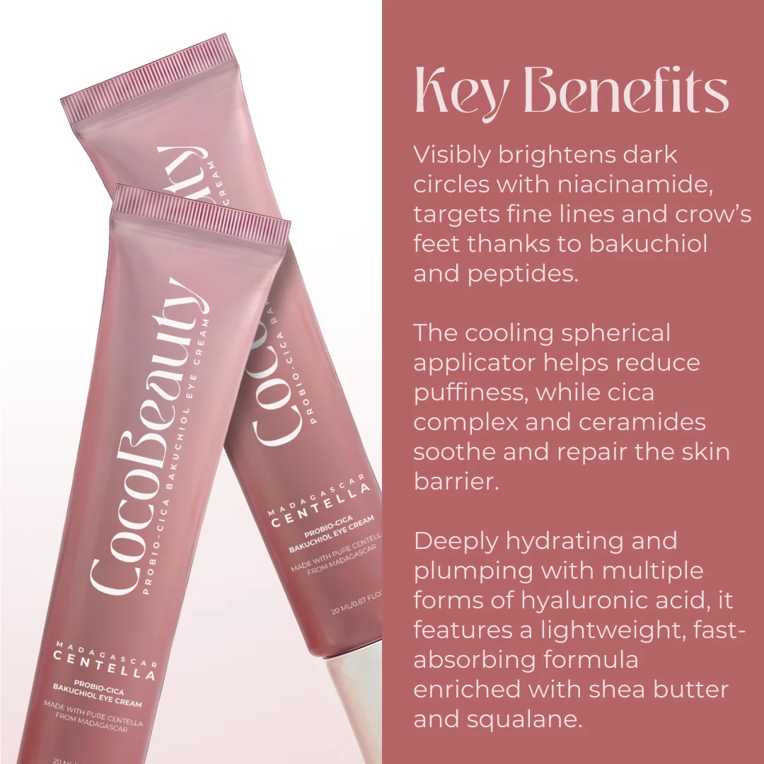 كريم مخصص لمنطقة العين يساعد على تنعيم الخطوط الدقيقة وتحسين مظهر الهالات والانتفاخ، بتركيبة لطيفة تحتوي على الباكوتشيول (بديل الريتينول) والبيبتيدات.